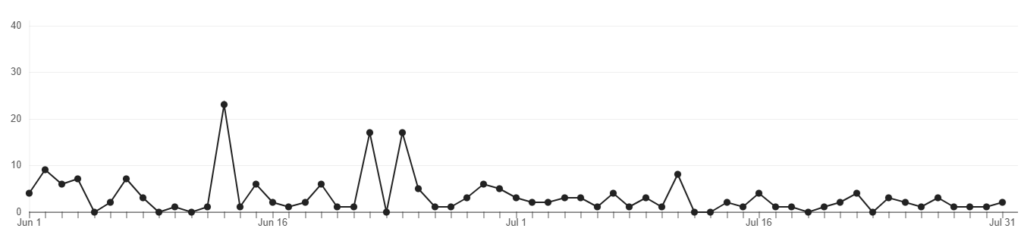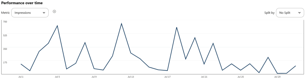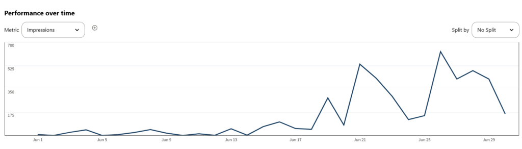 アカウント条件 2025年6月に開設した新規アカウントで、投稿は1日2回。これはAIに投稿頻度についてアドバイスを求めたら少なくても初期は1日2回の投稿をおすすめするということだったので従った次第です。最初はPinterestのSEOに認知されないらしく、多少ばらつきがありますが、6月末にかけては増加傾向に。