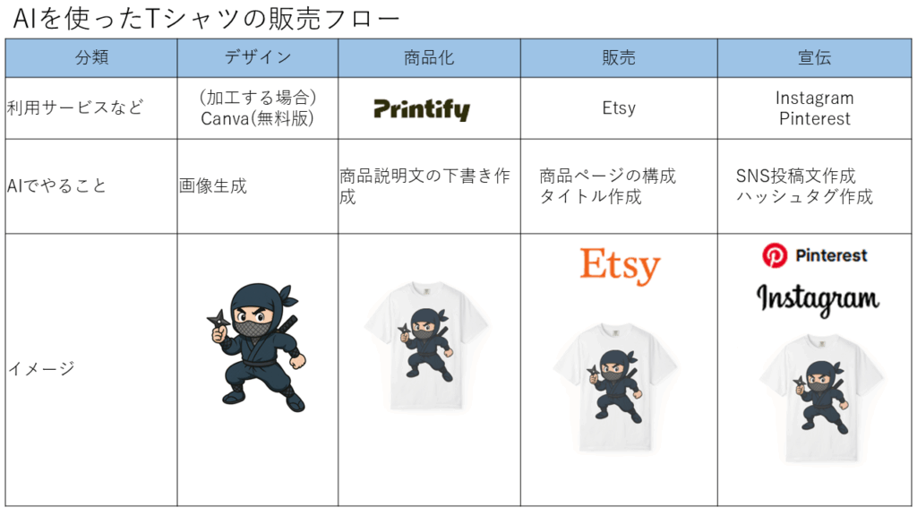AIで絵を生成→Tシャツプリントする→販売文をAIで生成→商品完成→AIで作成した広告文を用いてSNSへ投稿して宣伝→結果でないことはAIに対処方法をきく